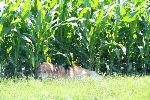 Cornflowers dancing with cornstalks swaying in the wind